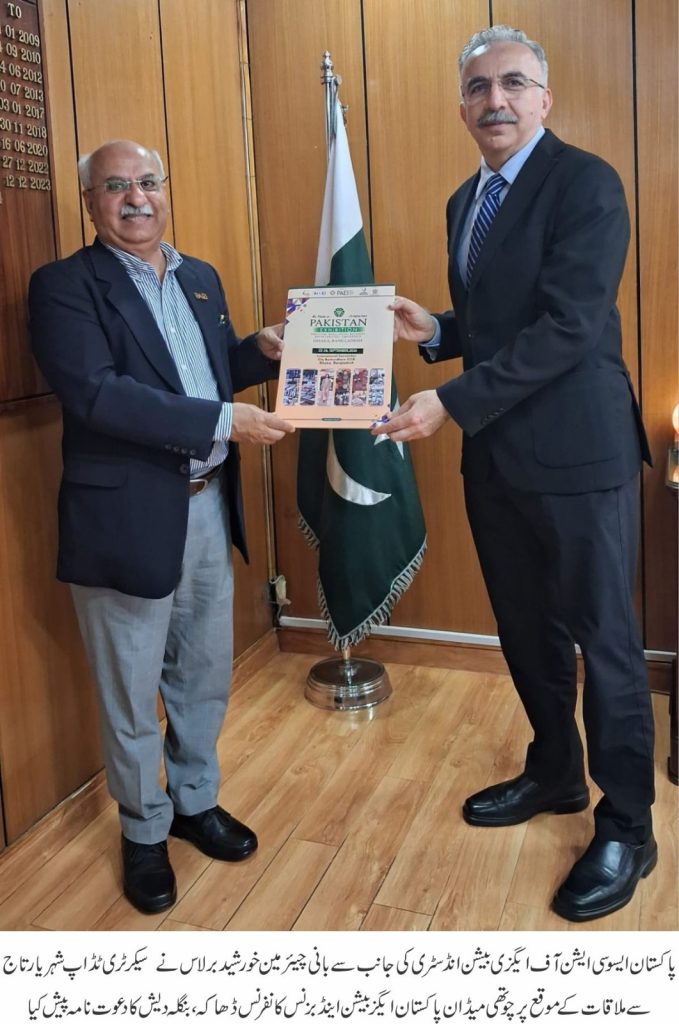 پاکستانی مصنوعات کو عالمی سطح پر متعارف کرانے کے لئے اقدامات اٹھانے کی ضرورت ہے ۔پاکستانی مصنوعات کو بنگلہ دیش میں بہت مانگ ہے بنگلہ دیش میں پاکستانی مصنوعات کو بہت پسند کیا جاتا ہے۔ ہم امید کرتے ہیں یہ نمائش اس تجارتی تعاون کو مزید مستحکم کرنے کے لیے ایک موثر پلیٹ فارم ثابت ہوگی۔آخر میںپاکستان ایسوسی ایشن آف ایگزی بیشن انڈسٹری کی جانب سے بانی چیئرمین خورشید برلاس نے ٹریڈڈیلپمنٹ اتھارٹی آف پاکستا ن سیکرٹری شہر یار تاج کو چوتھیمیڈ ان پاکستان ایگزبیشن اینڈ بزنس کانفرنس ڈھاکہ، بنگلہ دیش کا دعوت نامہ بھی پیش کیا۔
