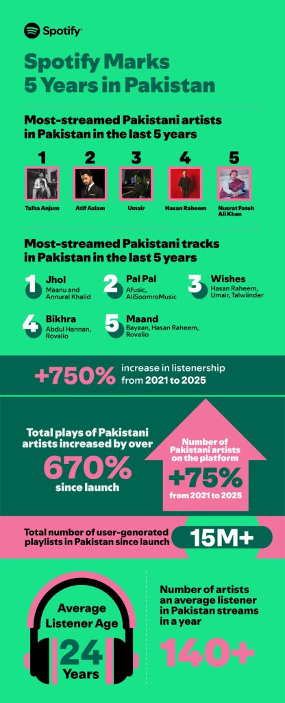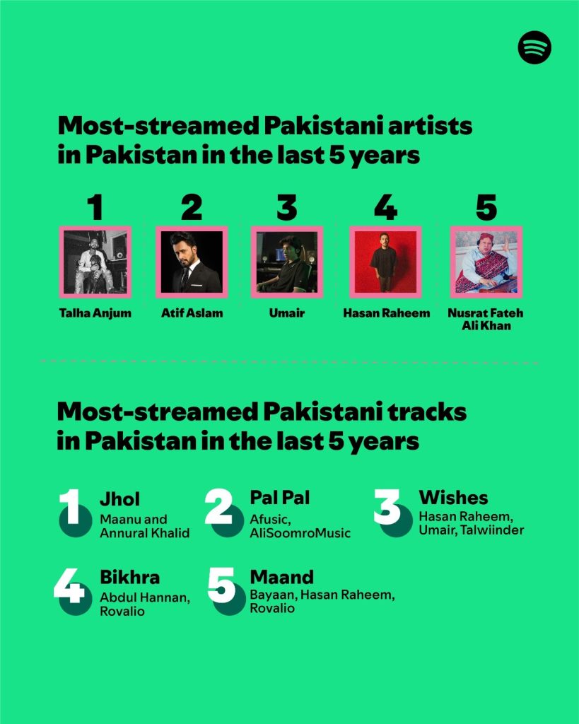 سامعین اسپاٹیفائی کی ”میڈ اِن پاکستان” پلے لسٹ کے ذریعے گزشتہ پانچ سال کے نمایاں گانوں کو سن سکتے ہیں۔